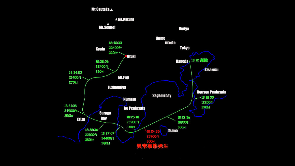 At 18:24:35, just before reaching the cruising altitude of 24,000 feet (7,315m) and approaching the east coast of the Izu Peninsula, there was a booming noise and the aircraft experienced an emergency situation which had serious impact on its further flight.